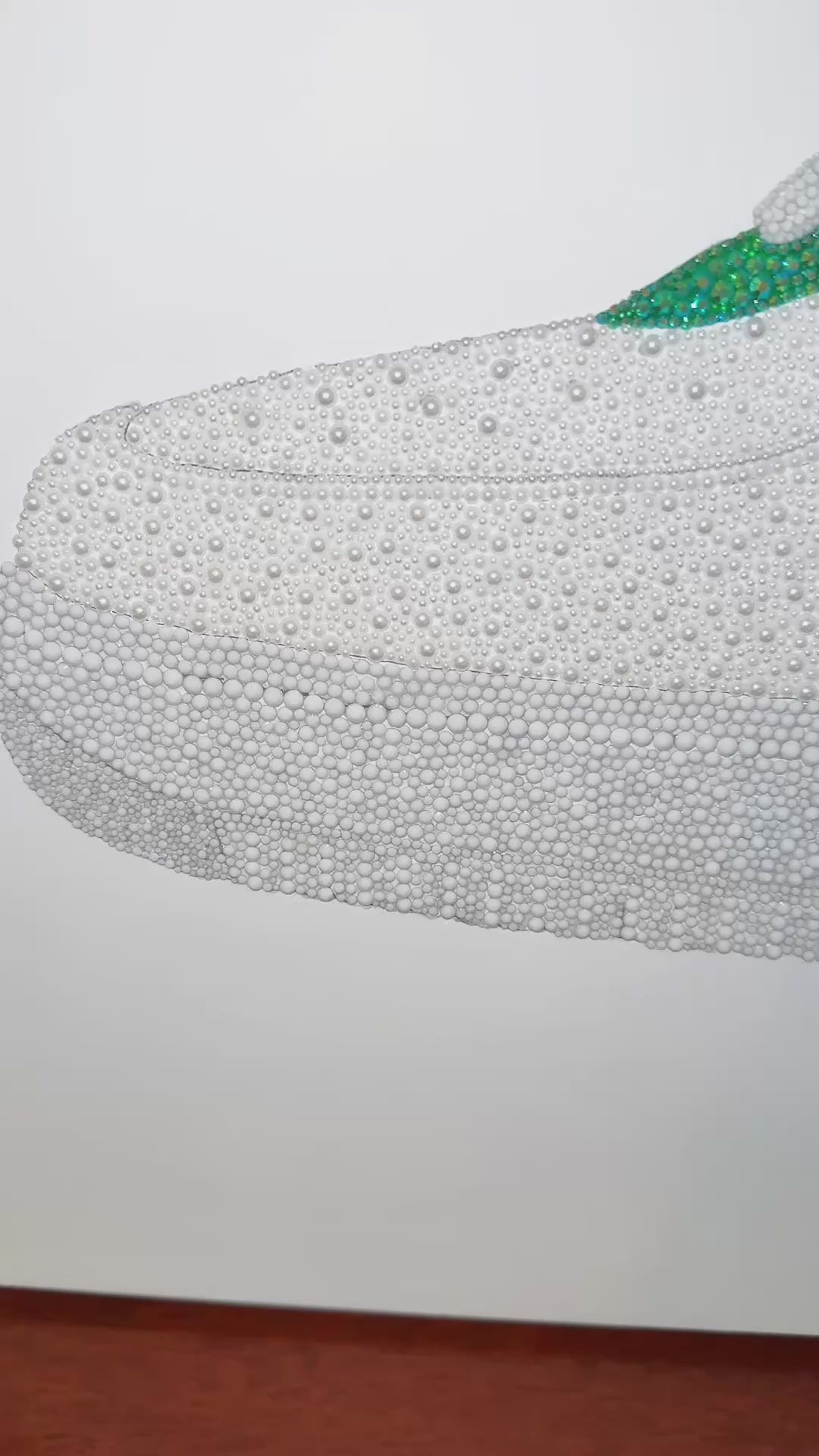 This one-of-a-kind crystal sneaker artwork features over 55,000 green, white, brown, and black crystals and pearls, forming a detailed Air Force 1 with Philadelphia Eagles' Saquon Barkley reverse hurdling over FLY. Each crystal and pearl was placed by hand, creating a collectible sports-inspired art piece that merges luxury materials with movement and energy.
